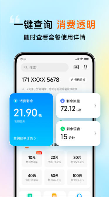 信息一目了然:账单查询、流量与语音剩余情况、卡号相关信息一应俱全,查询更加便捷。