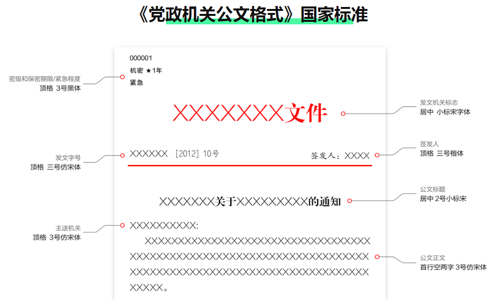 小标宋:发文机关标志,红色;标题,2号;信函格式,发文机关全称或者规范化简称;命令(令)格式,发文机关标志由发文机关全称加“命令”或“令”字组成,红色;纪要格式,纪要标志由纪要标志由“XXXXX纪要”组成,红色